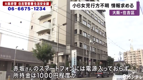大阪府警は19日、大阪市住吉区に住む小学6年の赤坂彩葉(いろは)さん(12)が17日から行方不明になっている、と発表しました。