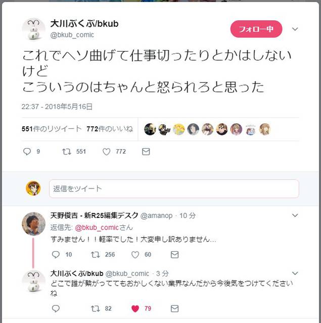 大川ぶくぶさんは天野俊吉さんのツイートを発見後、一度は激怒したものの、その後「気をつけてください」と収めた事で、その対応にファンが大人の解決だと絶賛する声があったそう。