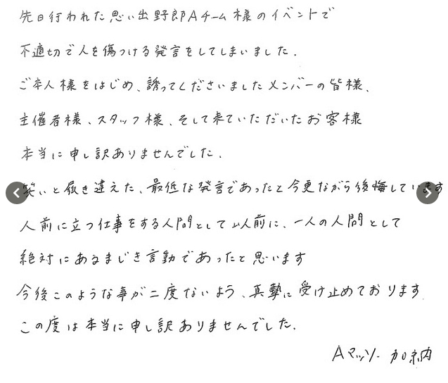 Aマッソの二人は9月22日に東京・二子玉川で開催された無料イベント「思い出野郎Aチーム presents ウルトラ“フリー”ソウルピクニック」にて、大坂なおみ選手をネタで取り上げ、さらに差別的な発言をしたとしてネット上で炎上騒ぎになっていたようです。