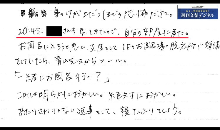 お風呂に入ろうと思い、支度をして1Fのお風呂場の脱衣所で準備をしていたら、青山先生からメール。