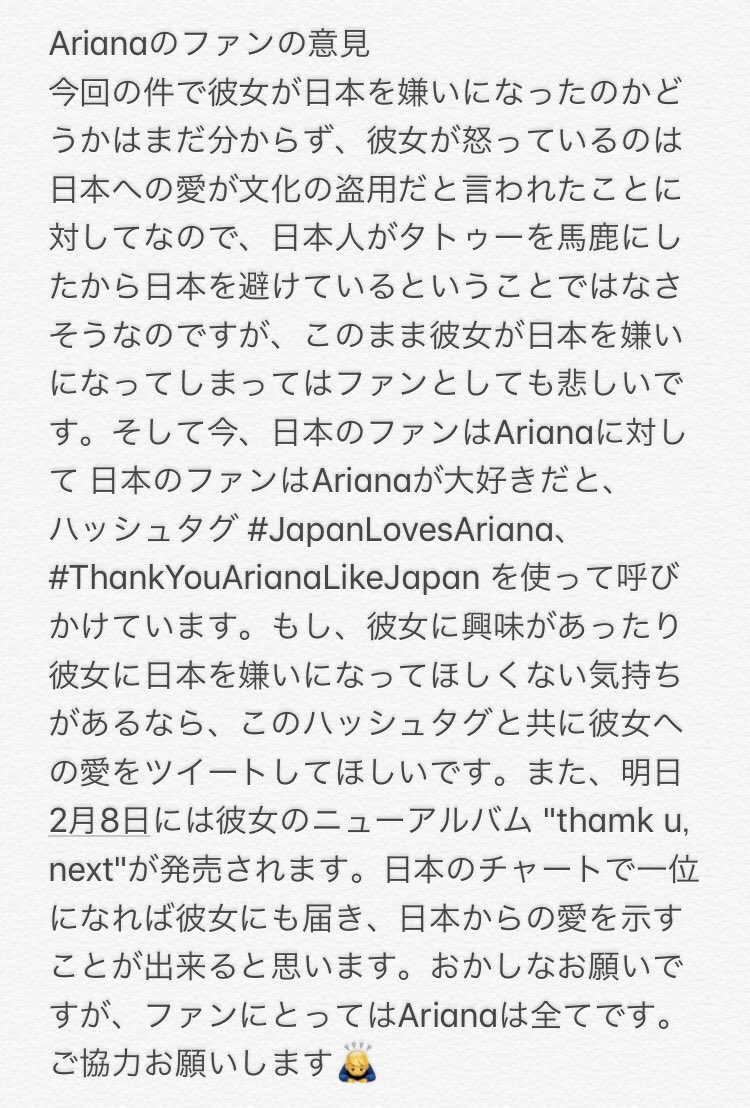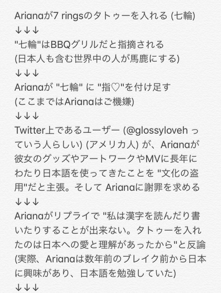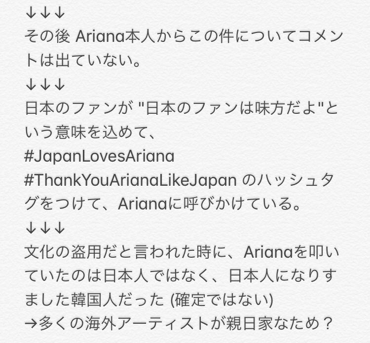 Arianaが日本語を使うことを「文化盗用」と言ってるのは韓国人だし、日本人の多くは文化の盗用(Cultural Appropriation)とは思ってないし寧ろ日本大好きと言ってくれるの嬉しいけどな
