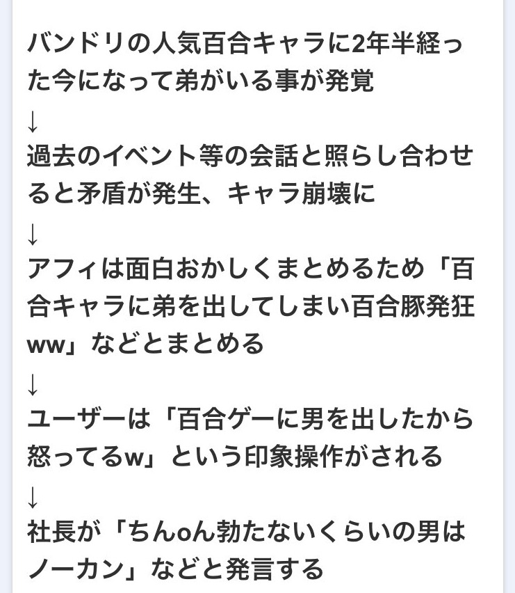 今井リサの弟の存在設定変更でまたプチ炎上してるけど、問題はリサ姉に弟がいることじゃなくて、弟が存在したことで今までの2年間のストーリーに矛盾が生まれることだったから、修正は妥当。身近に男がいるなんて許せない系オタクと外野は論点がそもそも違うからどうしようもない(オタク特有の早口)