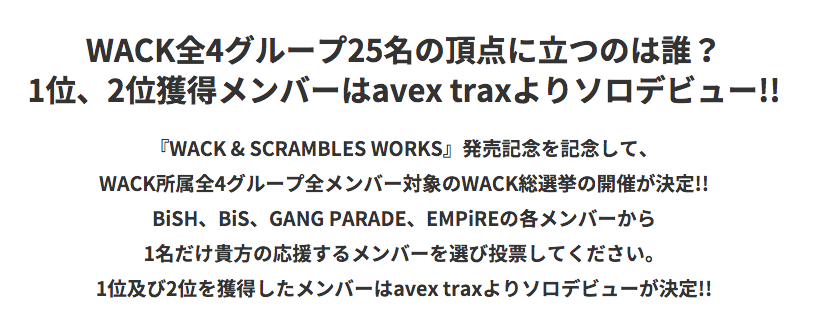 画像引用元:https://ssl.avexnet.or.jp/wackscrambles/voteWACKはBiSHを始動すると宣言した渡辺淳之介が社長を務める会社で、BiSHはWACKに所属しています。