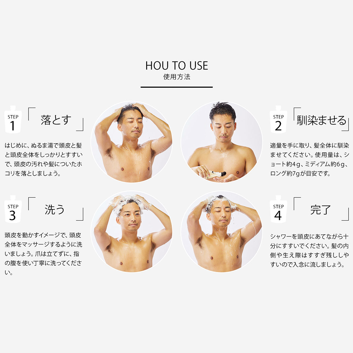 先に汚れや付着した誇りを落とした後にバルクオムシャンプーを手に取り、髪全体になじませます。