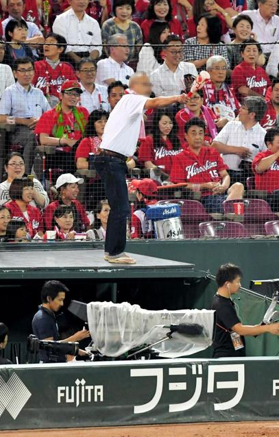 カープファンがカメラマン席上の屋根に乗って猛抗議!