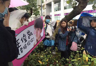 手に持つプラカードには「王俊凱、私をお嫁にもらって!」と書かれており、あまりに過激なファンの存在もあって交際できない事情があるのかも知れません。