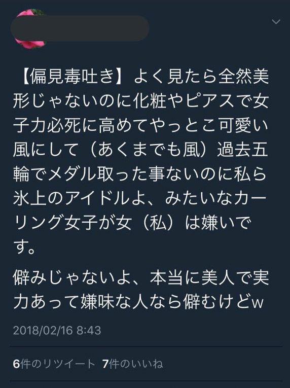 カーリング女子嫌いってタグでててさ、思ってんけど嫌いなんやったら見んなって。それを思ってもそれを口に出すなって。性格悪いとかそういう競技やし。化粧するくらい、ピアスするくらいええやん。女の子やん?4年間頑張って、オリンピックでてんのにこんな仕打ちなくない。じゃあやってみろって。 pic.twitter.com/u3aSylc6yJ