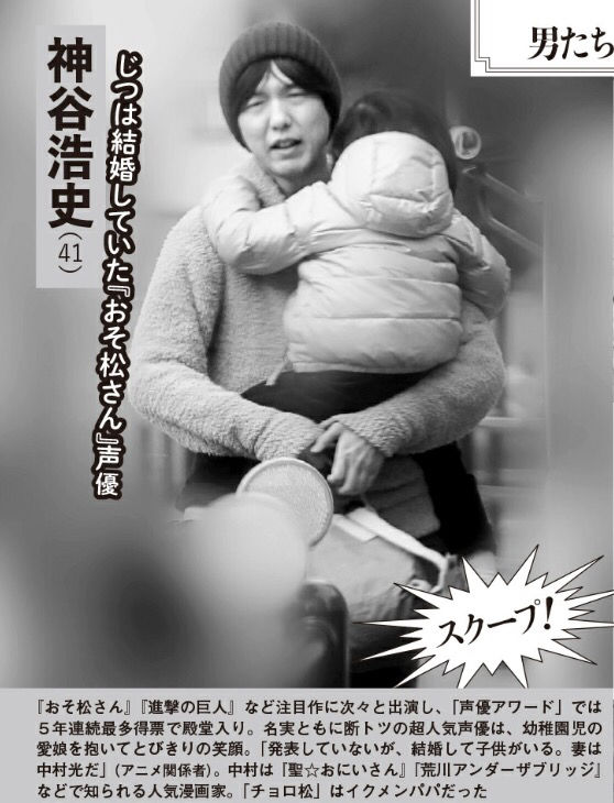 とある写真が週刊誌によって流出したことで、ファンの間で神谷浩史さんは「結婚していて子供までいた」との事実が発覚しました。