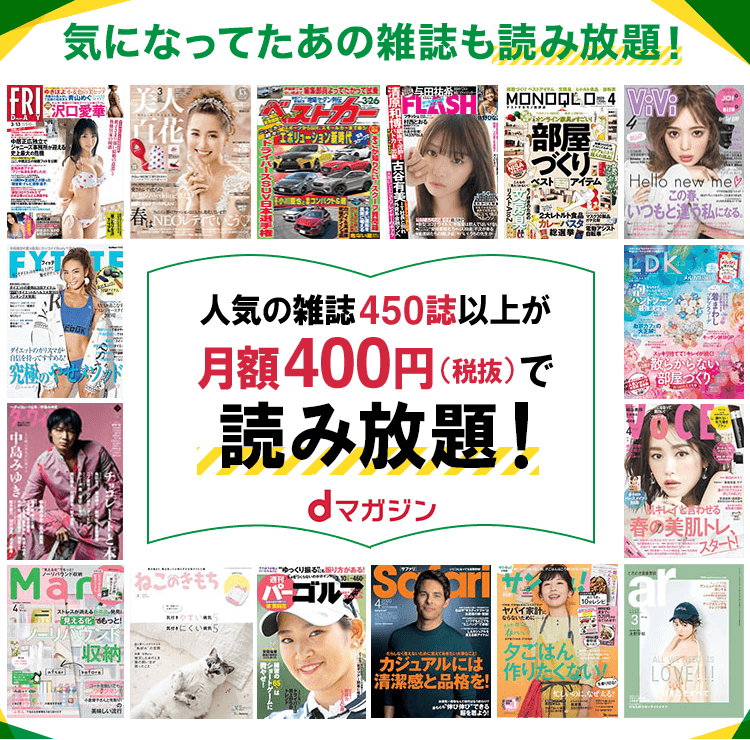 NTTドコモが提供しているdマガジンでは、バックナンバーを含めて1700冊、最新号450誌以上が月額400円(税抜)で読み放題と大変オトクなサービスになっています。
