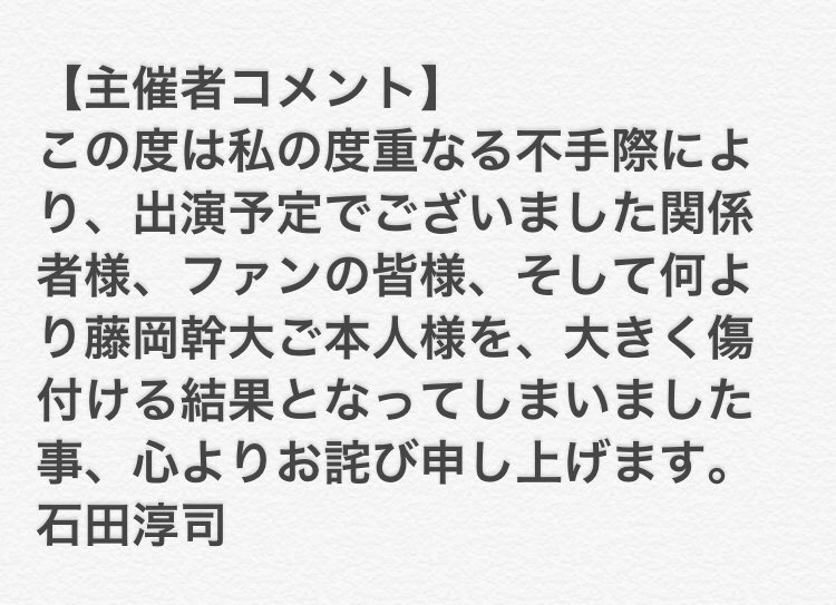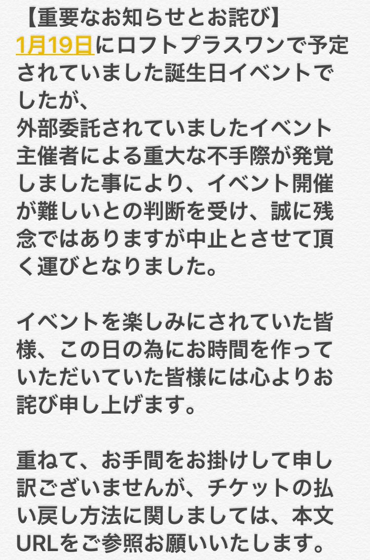 1月19日に予定されていました「藤岡幹大のお誕生日会」ですが、イベント主催者の不手際により下記の通り決定が下されました。