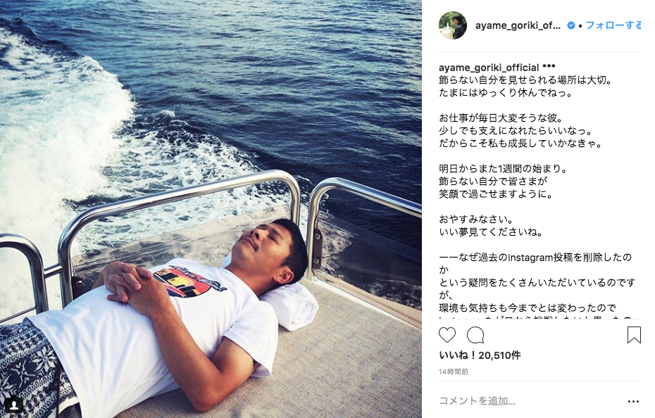 こちらの投稿は剛力彩芽さんがInstagramの全投稿を削除したあと、初めての投稿したもの。剛力彩芽さんの投稿そのものには、前澤友作さんがこの写真を撮影したことは書かれていませんでした。