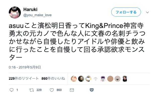 asuuこと濱松明日香ってKing&Prince神宮寺勇太の元カノで色んな人に文春の名刺チラつかせながら自慢したりアイドルや俳優と飲みに行ったことを自慢して回る承認欲求モンスター