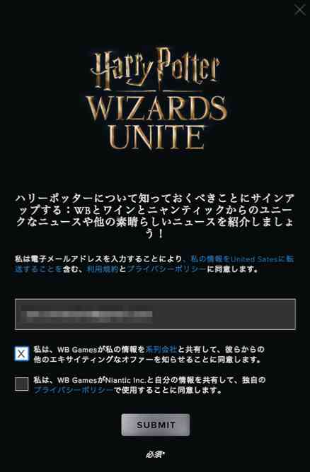 実際にハリポタGO公式サイトからサインアップしようとすると、このような画面が表示されます。サインアップすると、今後ハリポタGOの最新情報が登録したメールアドレスに送られてくるようです。