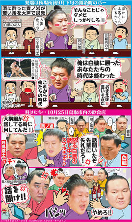 同席していた元幕内力士は「注意したつもりが、貴ノ岩はでかい声で返してきた。横綱の友人もいたのに…」と振り返る。白鵬を否定されたように受け止めた白鵬と懇意にしている友人は、気を悪くしていたという。後日、同席者によって、事情は白鵬に伝わった。