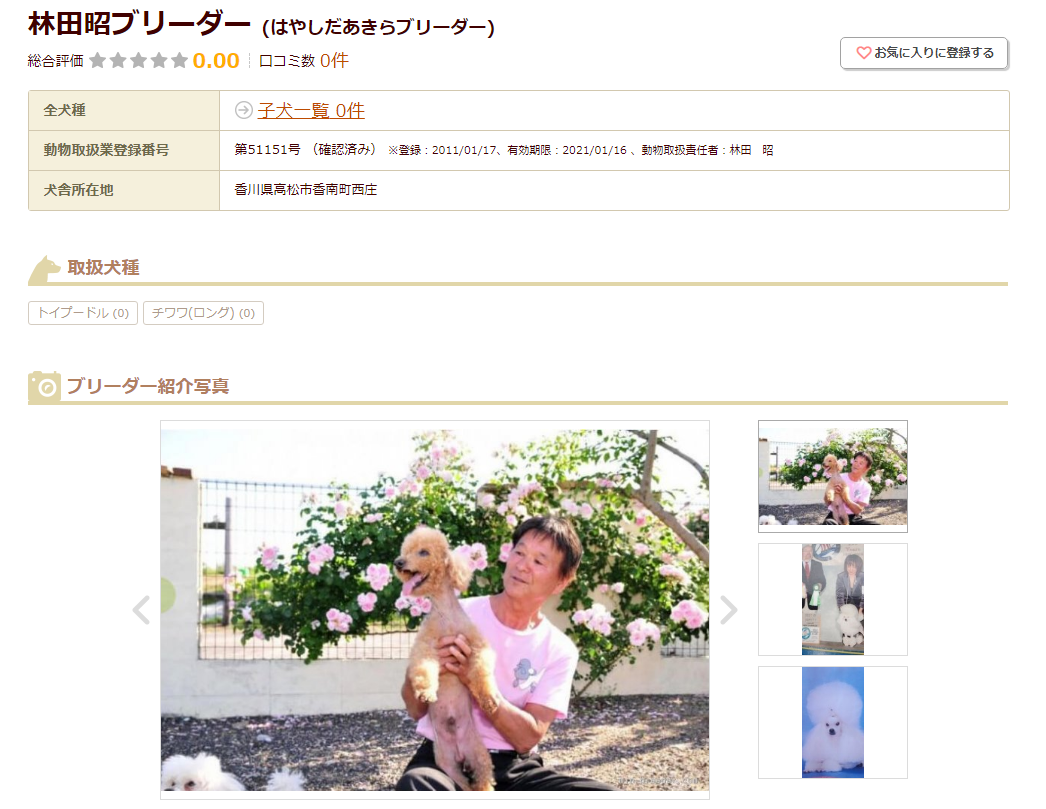 林田崇容疑者の父親である昭さんは香川県でブリーダー事業を展開しており、上記画像のようにブリーダーサイトへの登録も確認する事ができました。