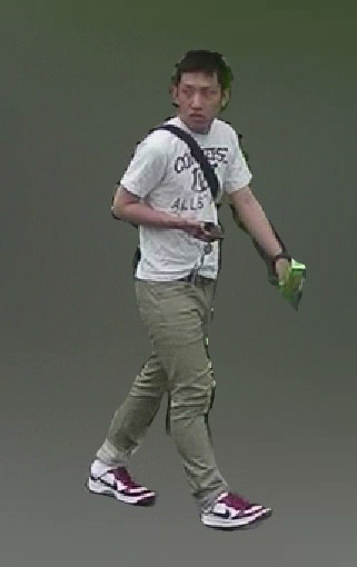 長袖、長ズボン姿で、青いウィンドブレーカーのようなものを着て、黒のキャップとリュックサックを所持していた。