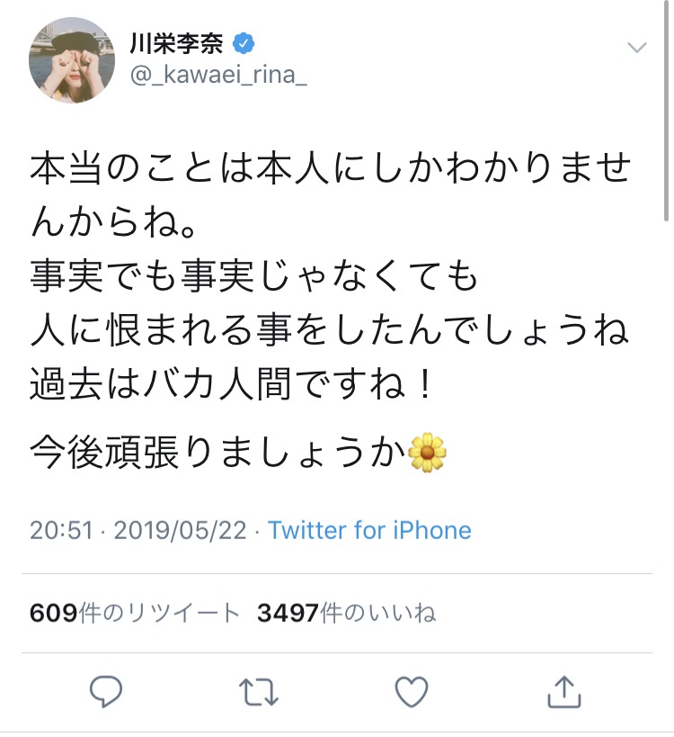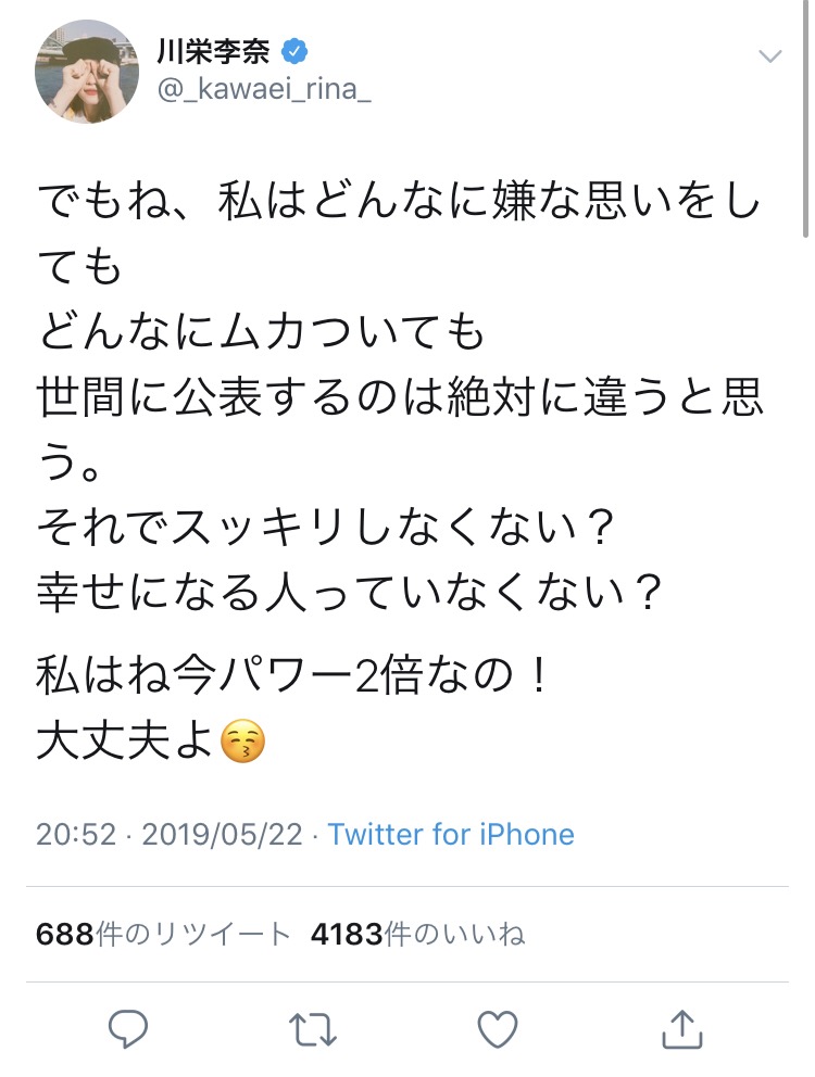 2019年5月22日、廣瀬智紀さんの二股報道に対して、川栄李奈さんがTwitterを更新。