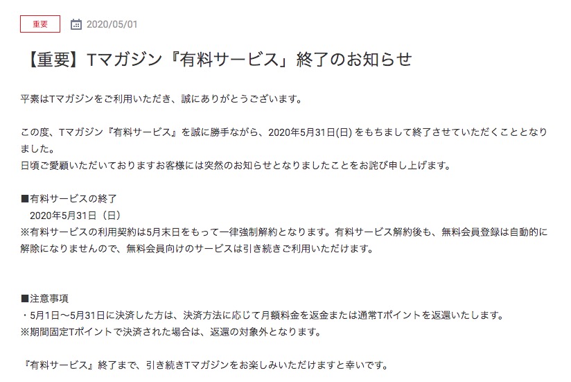 Tマガジンの有料サービスは2020年5月31日をもって、終了することになったそうです。