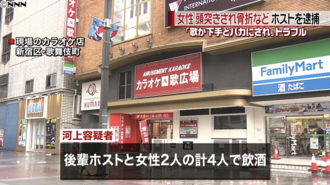 東京・歌舞伎町のカラオケ店で女性に頭突きをして骨折させたとして、ホストの男が逮捕された。