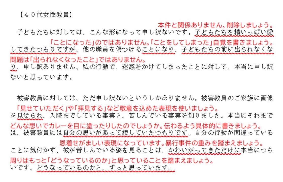 国語力の低い私でも、特に40代女性教員の文章が、幼く、拙く、下手くそ❗に感じてました。この添削のお陰で大人とは、謝罪とは、反省とは、を学べました(^^)ありがとうございました❗
