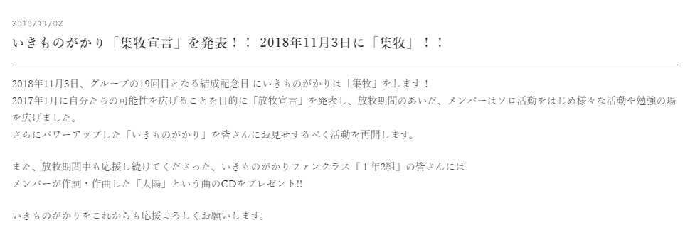今回はいきものがかりが活動再開を意味する「集牧宣言」をしたことについてまとめさせて頂きました。