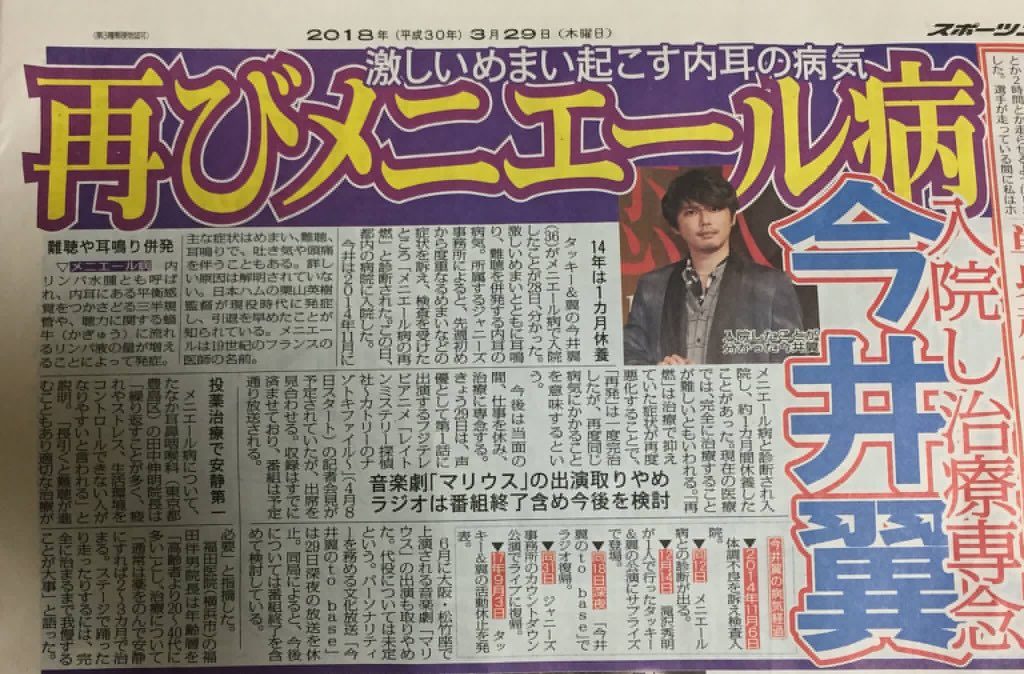 https://twitter.com/nishihataoikaze/status/979065294151827456「タッキー&翼」の今井翼(36)が、メニエール病を再発したことが28日、分かった。関係者によると、先週から度重なるめまいなどの症状を訴え、この日午後に入院した。