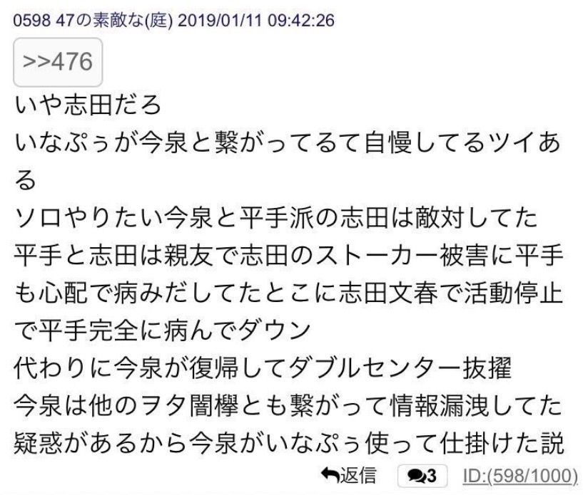いなぷぅが「今泉佑唯さんと繋がりたい方は明日〜〜」と発言した3日後に「欅坂の寮の住所を売ります」とかそれ…疑われてもしゃーないような。11月欅の寮うろついてる発言。志田はメッセでつきまといの件を発信してる。