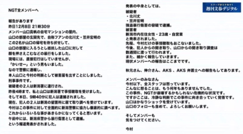 その上で「当然のことながら、今回の事件を受けて山口真帆本人は精神的なショックを受けております。今回このように山口真帆本人から公表する形になってしまったことは、本人やファンの皆様への説明や対応が不十分だった為であり、今後はこのようなことがないよう、全グループメンバーへの防犯ベルの支給、各自宅への巡回等の対策を徹底するなど、これまで以上に再発防止策を講じるとともに、メンバーとの信頼関係を築き、山口真帆をはじめ全メンバーの精神的ケアを、スタッフ一同全力で行なっていく所存です。ファンの皆様、関係者の皆様には、多大なご心配とご迷惑をおかけしましたことを深くお詫び申し上げます」と謝罪した。