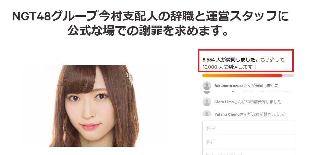 この署名活動の目的は、NGT48劇場支配人・今村悦郎さんの辞職。