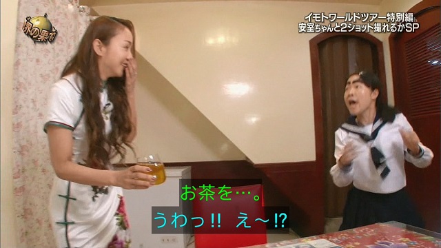コンサートを堪能した翌日にイモトアヤコさんは苦手なヘビ料理をリポートしているところに、安室奈美恵さんが「ドッキリの仕掛人」として登場。イモトアヤコさんは安室奈美恵さんを前に「すごくすごく大好きです」と号泣し、約30分にわたる夢の対談を行い、安室奈美恵さんもイモトアヤコさんの「安室愛」に感動し涙を流しています。最後には安室奈美恵さんと無事2ショット写真を撮り、安室奈美恵さんの展示会に掲示されることも決定しています。