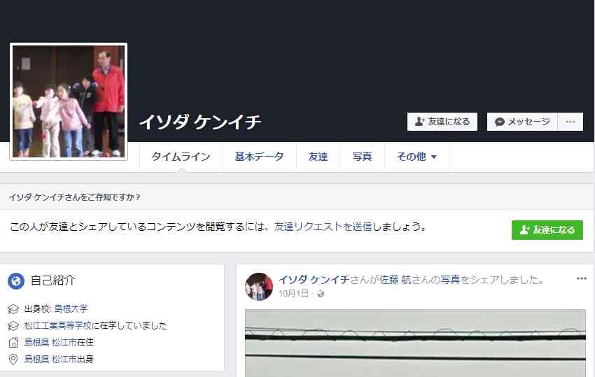 https://www.facebook.com/poohsan.ken?hc_ref=ARQ7ZpzvVg750maX1zMosNH4ZeddVUrz3Scy3Nw1UhIZsLoN18He2gheA7vHcRRcmq8磯田謙一容疑者のFacebookアカウントは既に上記のものと特定されており、プロフィールの画像は子どもたちと磯田謙一容疑者とみられる人物が一緒に写っているものとなっていました。