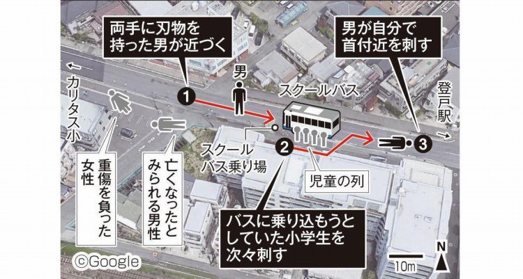 2019年5月28日7時45分頃、川崎市の登戸駅付近の路上で、私立カリタス小学校のスクールバスを待っていた小学生の児童や保護者らが近づいてきた男性に相次いで刺された。