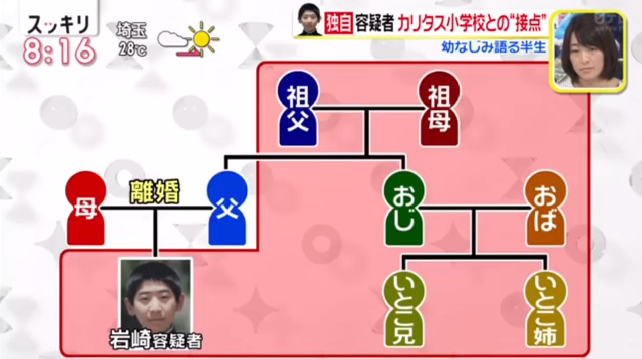 おじ夫婦には、岩崎容疑者より年上の男女の子供がおり、子供の頃は3人がきょうだいのように暮らしたとみられる。別の近隣住民はスポニチ本紙の取材に「いとこ2人はカリタス小に通っていたと聞いた」と証言。一方、岩崎容疑者は地元の公立小を卒業。子供時代の複雑な家庭環境を背景に、岩崎容疑者が一方的で理不尽な恨みを抱き、カリタス小の児童らを襲った可能性が出てきた。