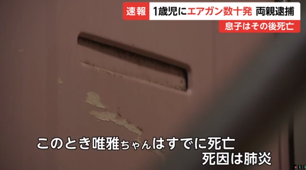 警察によると、2人は2018年11月下旬ごろ、当時1歳だった三男の唯雅ちゃんの全身をエアガンで数十発撃ち、3週間のけがをさせた疑いが持たれている。