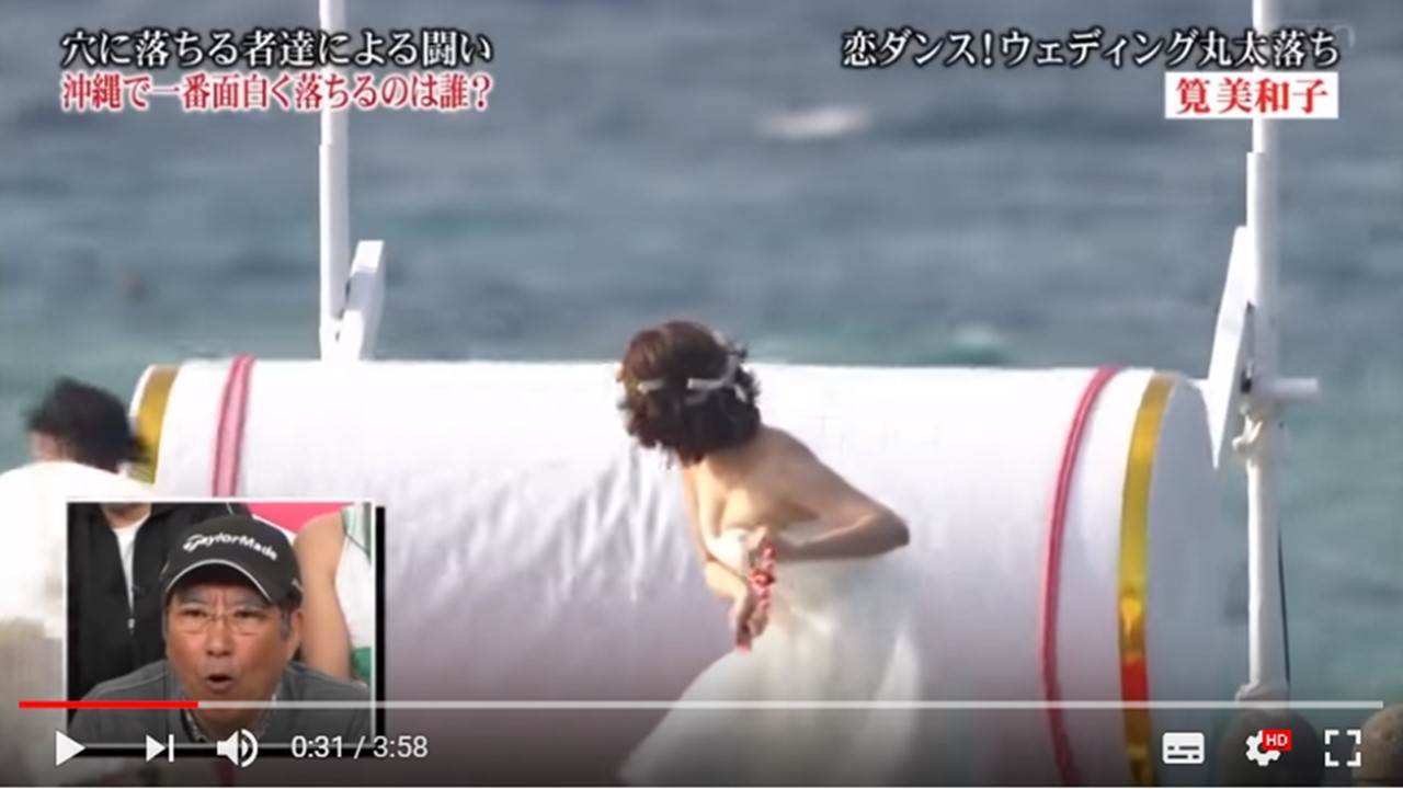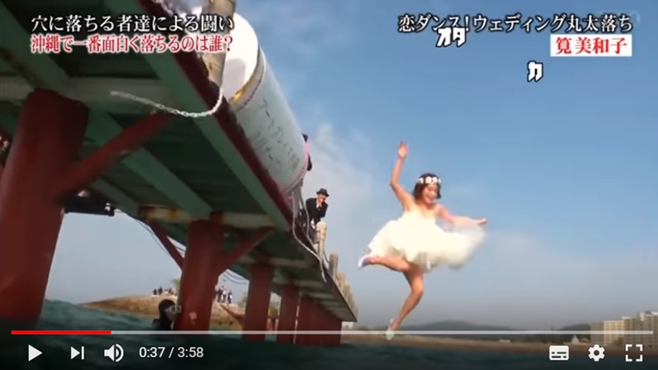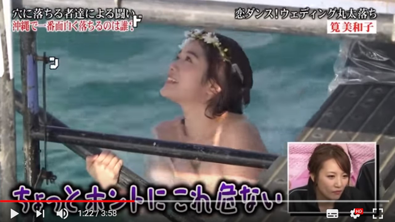とんねるずのみなさんのおかげでしたの番組内のドッキリ企画「全落・水落オープン」に筧美和子さんがウエディングドレス姿で登場しました。転がってきた巨大クラッカーに当たって海に落とされるシーンで、危うくドレスが脱げそうになりポロリ寸前でした。