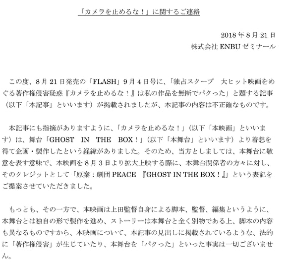 この度、「独占スクープ 大ヒット映画をめぐる著作権侵害疑惑『カメラを止めるな!』は私の作品を無断でパクった」と題する記事が掲載されましたが、