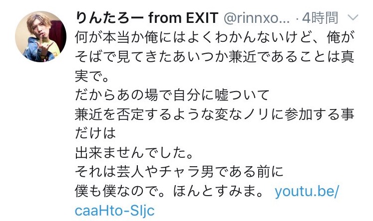 EXIT兼近さんの件は、24時間テレビのヤラセをバラされたことによる日テレと吉本が結託した何かじゃないか?という邪推。