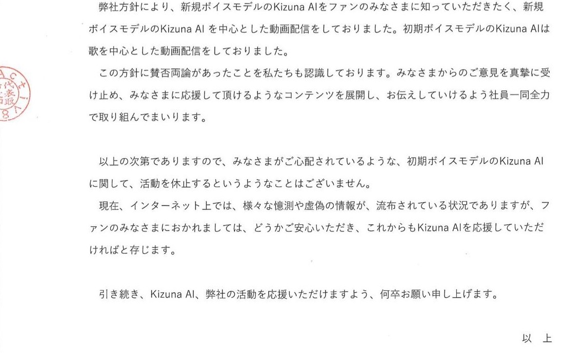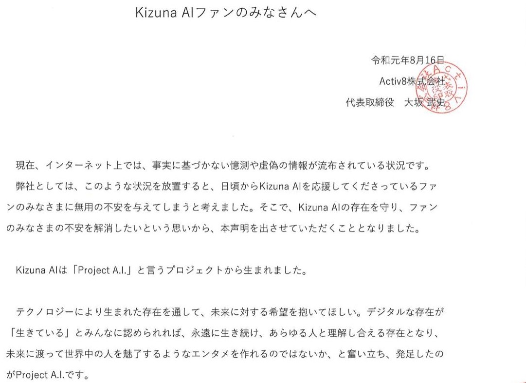 キズナアイの分裂炎上後、オリジナル(1号)が動画で謝罪!