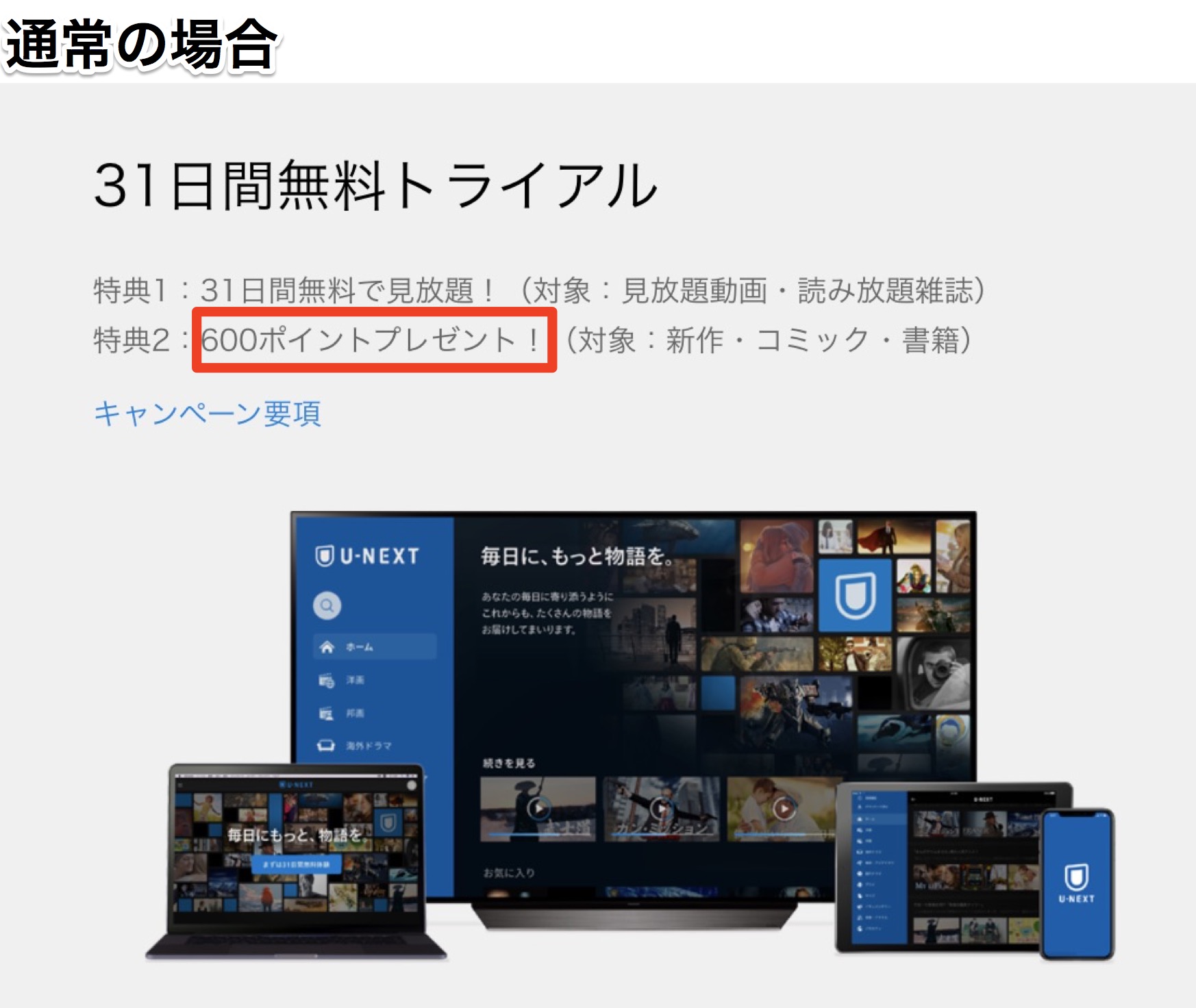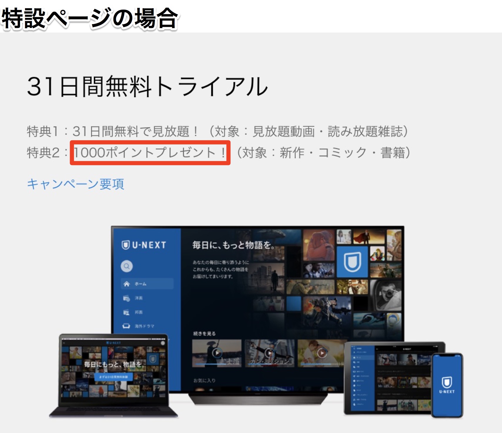 他のサイトから入会すると、600ポイントしか付与されませんが、この特設ページから入会すると、1000ポイント付与されるので、通常に入会するよりも、ちょっぴりお得に視聴することができます。