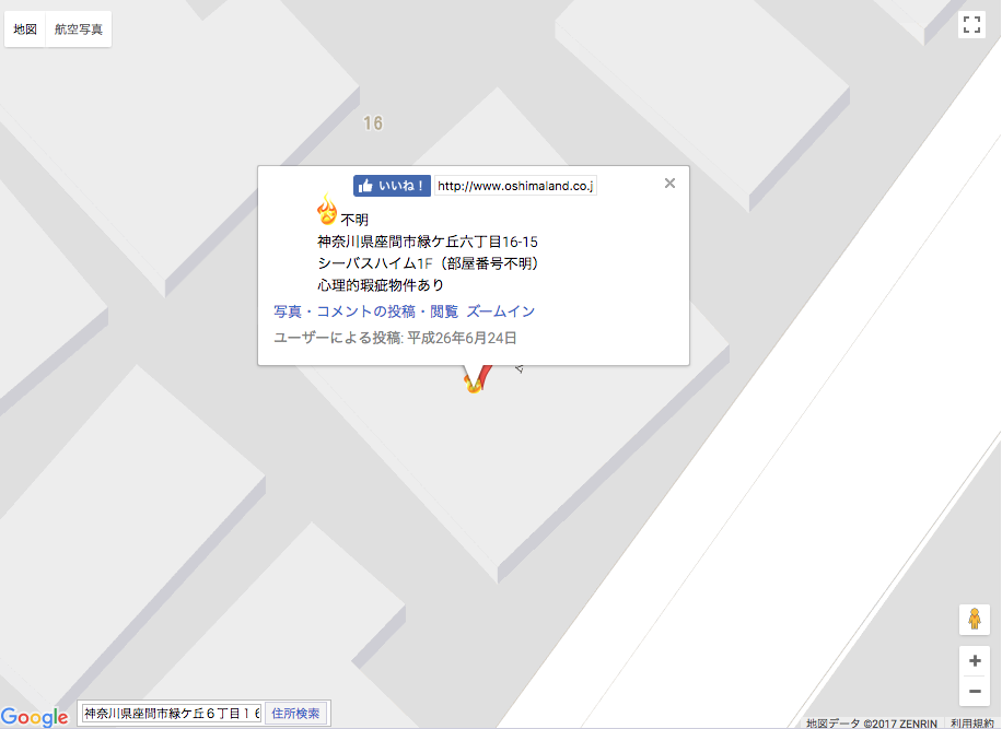 神奈川県座間市で複数の遺体が見つかったアパートをかの有名な大島てるのサイトで見てみたら炎マークがすでにある。2個ある。一つは今回の件、もう一つは3年ほど前に1Fで「心理的瑕疵」。