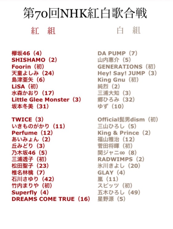 現在Twitterで、こちらの「第70回紅白歌合戦」の出場歌手が拡散されています。