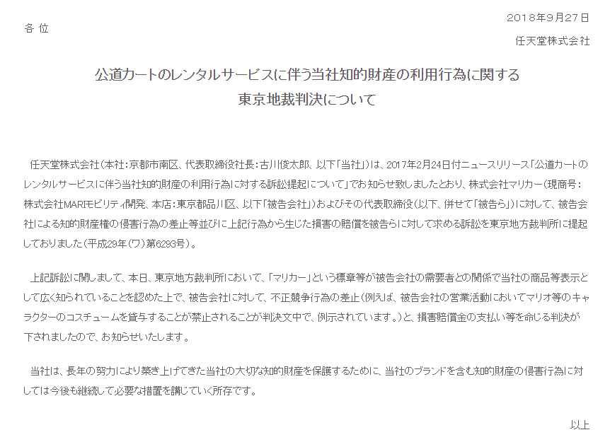 任天堂が「株式会社マリカー」事業者に勝訴!
