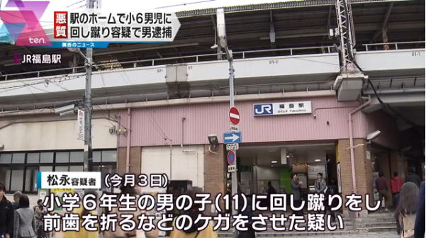 松永有平容疑者が福島駅のホームで小6男児に回し蹴りで前歯を折る怪我を負わせ逮捕