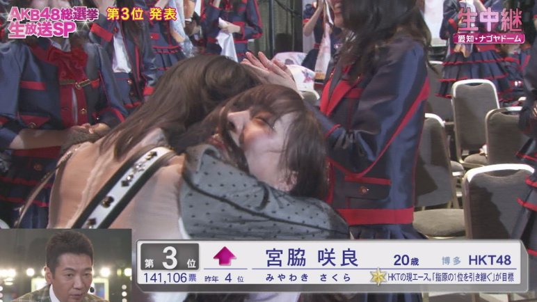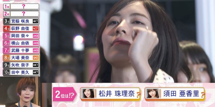 また、3位の宮脇咲良さんが発表された瞬間、松井珠理奈さんと須田亜香里さんのSKE48ワンツーフィニッシュが決定しました。