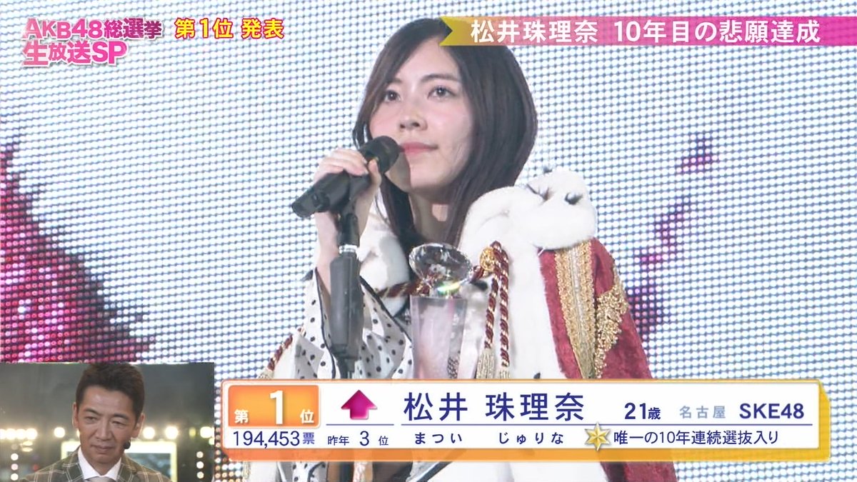 松井は「総選挙は地元の名古屋で開催だったんですよ。それから自分の10周年ってとこもあったり。去年1位、2位だった指原さん(指原莉乃)と麻友さん(渡辺麻友)が出場しないということで、絶対1位じゃんっていうプレッシャーがかかっていて。