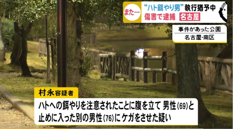 https://www.fnn.jp/posts/8628THK/201911151756_THK_THK警察によりますと、村永容疑者は午前10時過ぎ、南区の公園で鳩へのエサやりを注意されたことに腹を立て男性(69)の顔を殴り、