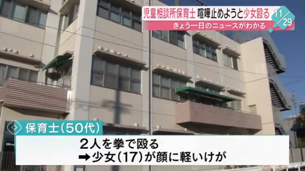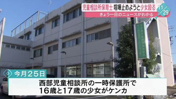 名古屋市によりますと、11月25日、西部児童相談所の一時保護所で、16歳と17歳の少女がつかみ合いのケンカになり、50代の保育士がケンカを止めようと、2人を拳で殴ったということです。