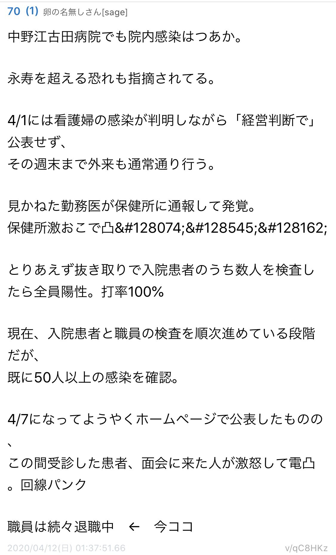 【速報】東京都中野江古田病院、5ちゃんねるの病院・医者板の #新型コロナウイルス スレで「台東区の永寿総合病院を超える恐れ」「既に50人以上の感染確認」として職員が続々退職していることを報告 pic.twitter.com/mf7XLDfKBC
