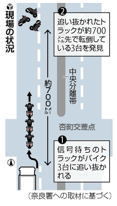 8人は大型バイク(1000cc)1台とミニバイク2台に分乗し、トラック運転手が信号待ちをしていた杏(からもも)町交差点から約700メートル北で倒れていた。