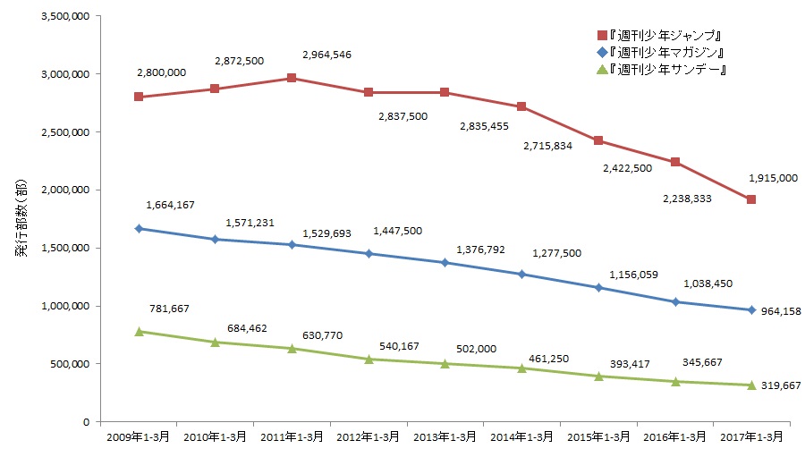 このグラフは各雑誌の発行部数の推移を示しているもの。摘発されたネタバレサイトが開設されたとされる2014年からどんどん発行部数は低下しています。